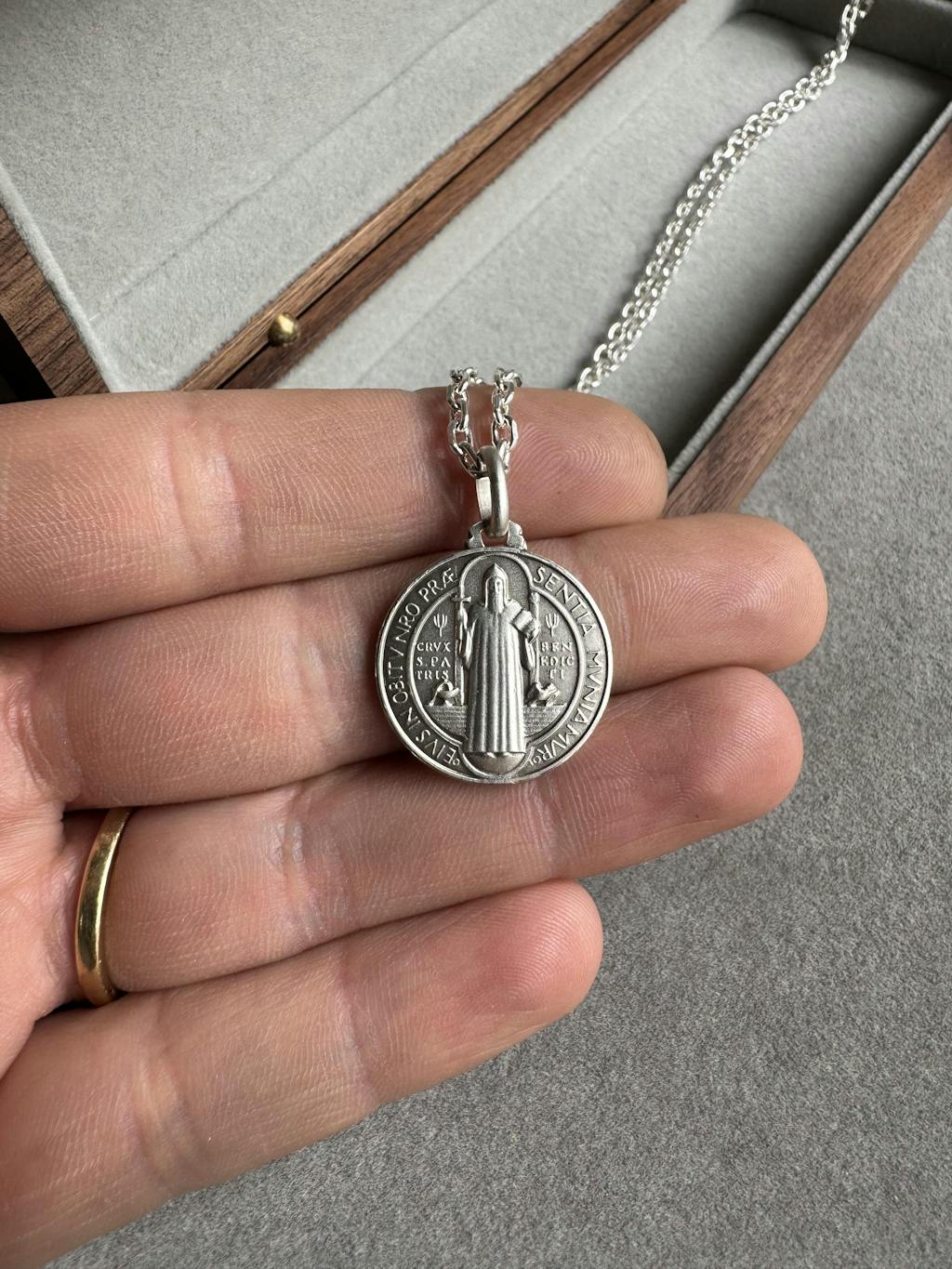 Esta medalla de San Benito está elaborada en plata 925, un metal noble que resalta por su brillo y pureza. El diseño conserva los símbolos tradicionales de la Cruz de San Benito, reconocida por su sentido de protección, atraer la paz y fortalecer la fe.